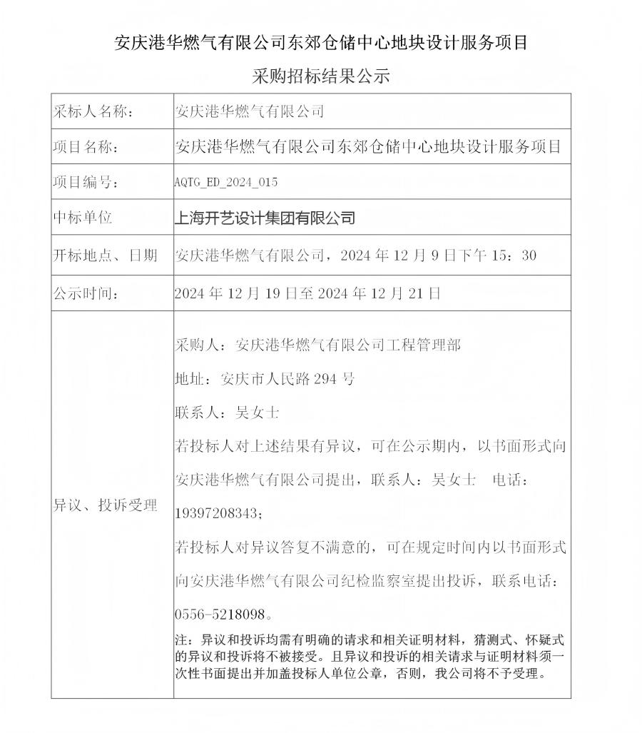 安慶港華燃氣有限公司東郊倉儲中心地塊設計服務項目采購招標結果公示