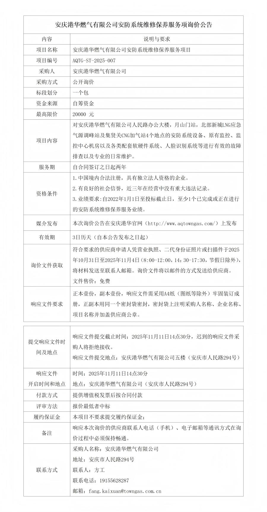 安慶港華燃?xì)庥邢薰景卜老到y(tǒng)維修保養(yǎng)服務(wù)項詢價公告